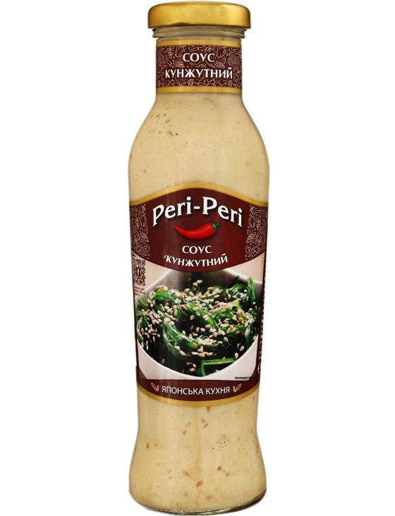 Склад: вода, олія соняшникова, насіння кунжуту 7%, соєвий соус (соєві боби, пшениця, сіль), цукор, сіль кухонна, олія кунжутна, емульгатор крохмаль модифікований, загусники (камеді гуарова і/або ксантанова), підсилювач смаку глутамат натрію, регулятор кислотності кислота оцтова, прянощі, консервант бензоат натрію, натуральний екстракт солодкої трави стевії, антиоксидант кальцію — натрію ЕДТА.