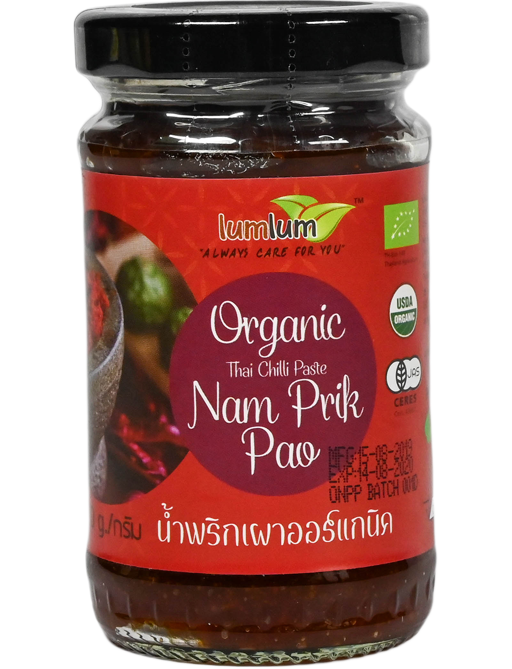- Органічна тайська паста чилі, відома тайською мовою як Нам Прік Пао, зазвичай називається смаженою пастою чилі в олії. Її виготовляють з м'якоті та насіння плоду чилі. Фрукти разом з іншими інгредієнтами пюрують та варять до консистенції, схожої на варення. Вона також має солодкий смак.