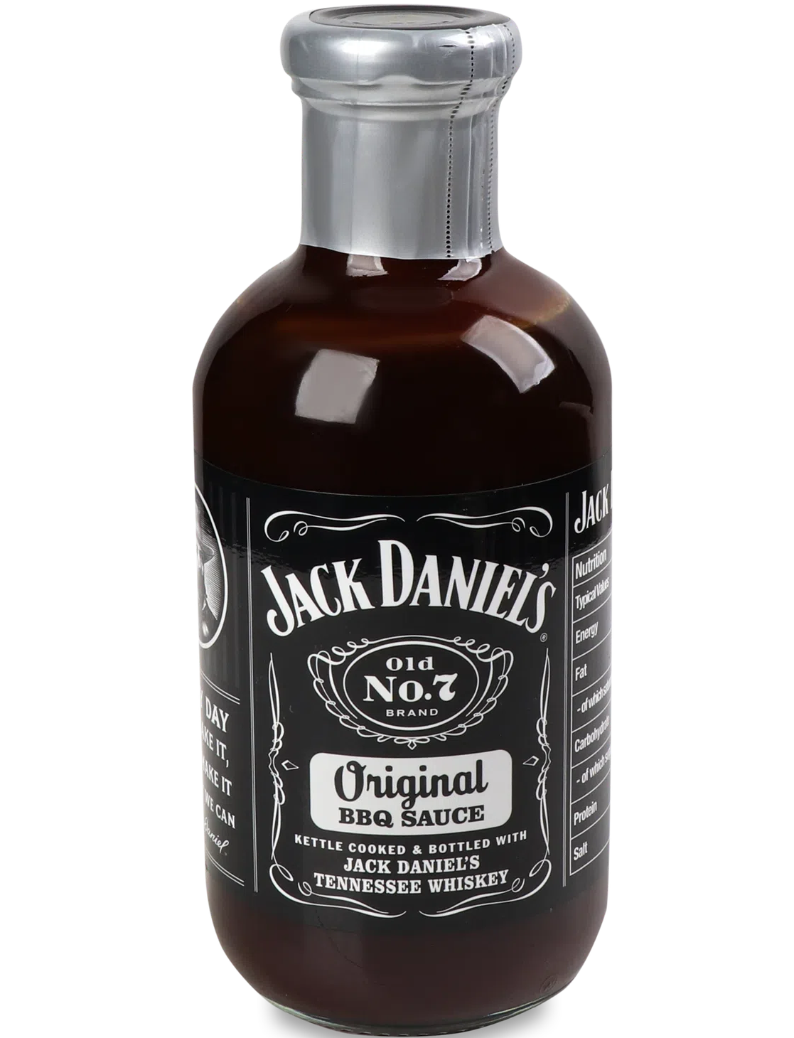 Склад: тростинний цукор, вода, томатна паста, сіль, цукор, часник, оцет дистильований, патока, концентрат тамаринда, рідкий дим, волоський горіх, сіль, гірчиця жовта(оцет дистильований, вода, насіння гірчиці, сіль, куркума, паприка, спеції), крохмаль кукурудзяний, концентрат ананасового соку, віскі Jack Daniel`s Tennessee (0,3%), сушений часник, сушений перець чилі, пектин (згущувач), барвник: карамель; спеції: сушена цибуля; натуральний ароматизатор: яблука.