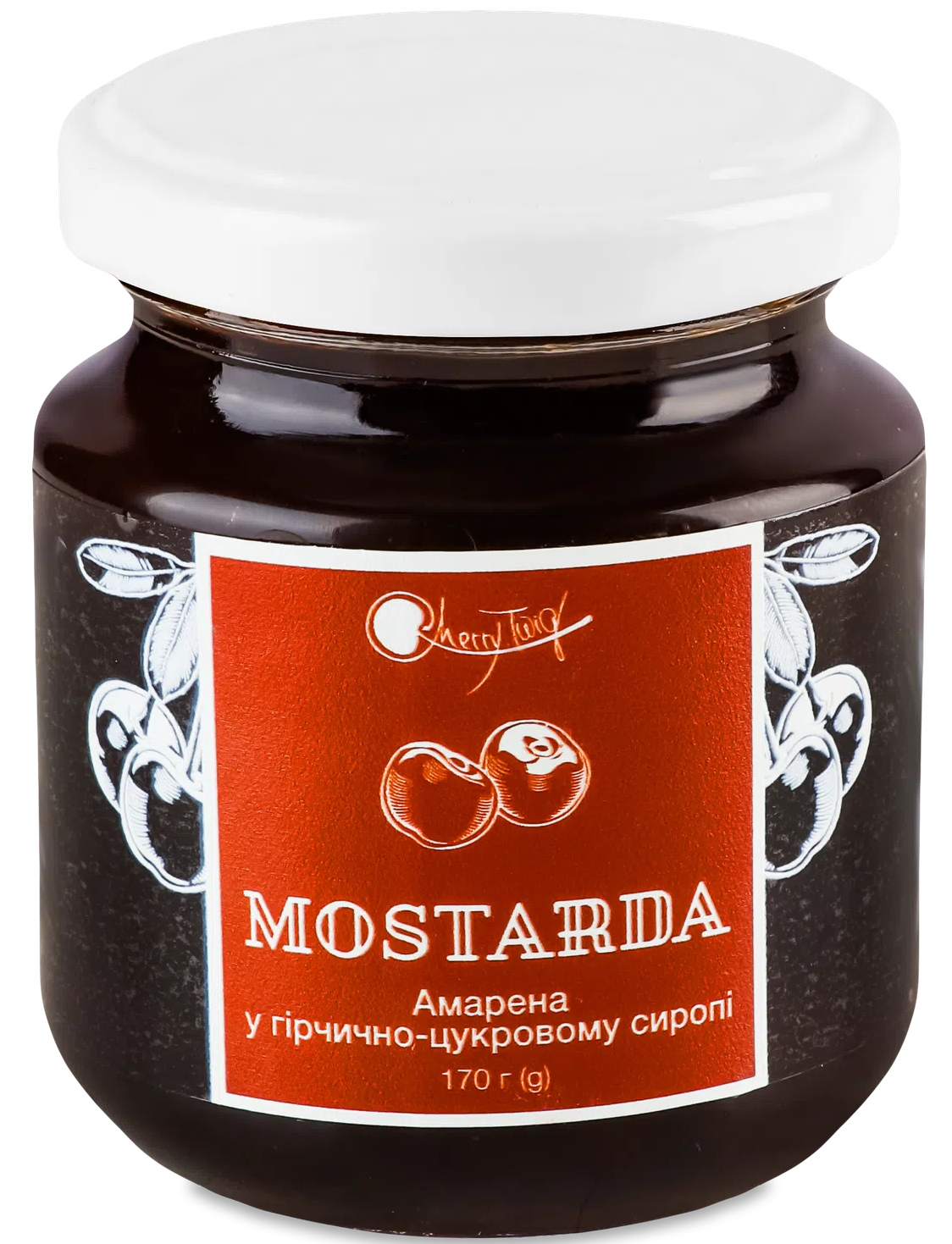 Склад: вишня (55%), цукор та/або глюкозно-фруктозний сироп, регулятор кислотності лимонна кислота, натуральний екстракт гірчиці, ароматизатор Амарена.