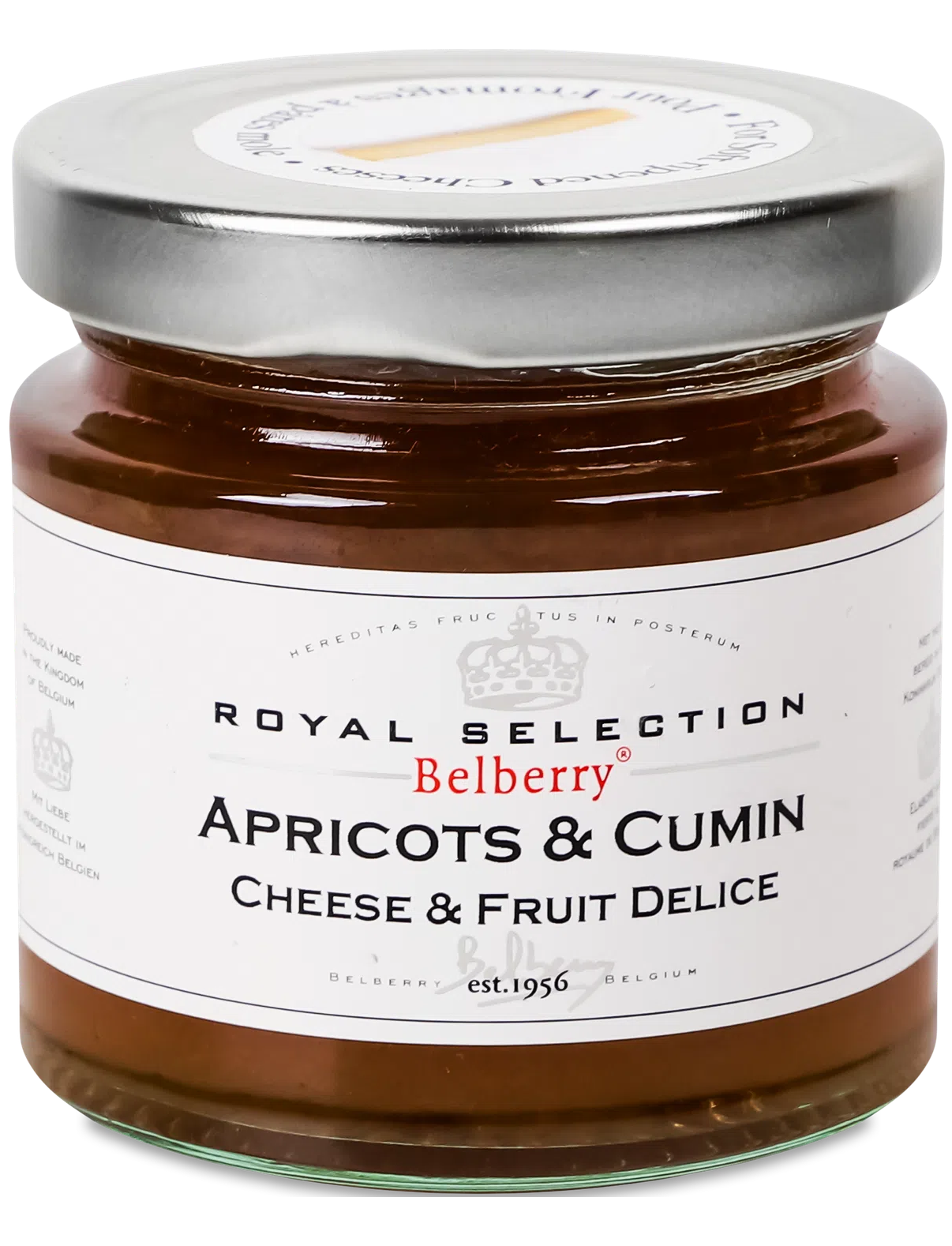 Натуральний конфітюр із солодких абрикосів з нотами кмину. Ідеальна пара до м’яких сирів. Просто додайте ложку конфітюру до крекеру або хлібців зі шматочком камамберу чи брі. Без консервантів і смакових добавок. Belberry – офіційний постачальник конфітюру для королівського двору Бельгії і є одним із кращих виробників конфітюру та чатні країни.
