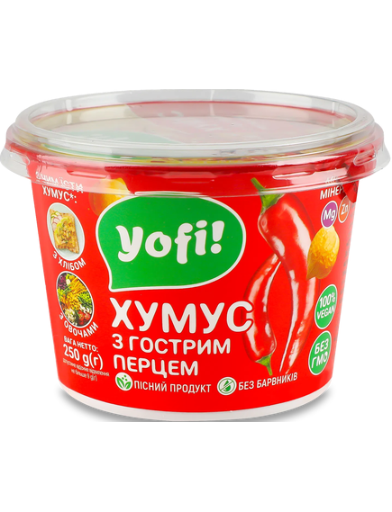 Склад: нут 50%, вода питна, гострий перець свіжий 10%, перець червоний солодкий свіжий, насіння сезам (кунжуту) 10%, олія соняшникова рафінована, сіль кухонна, часник мелений, регулятор кислотності - лимонна кислота, сорбінова кислота, бензоат натрію.