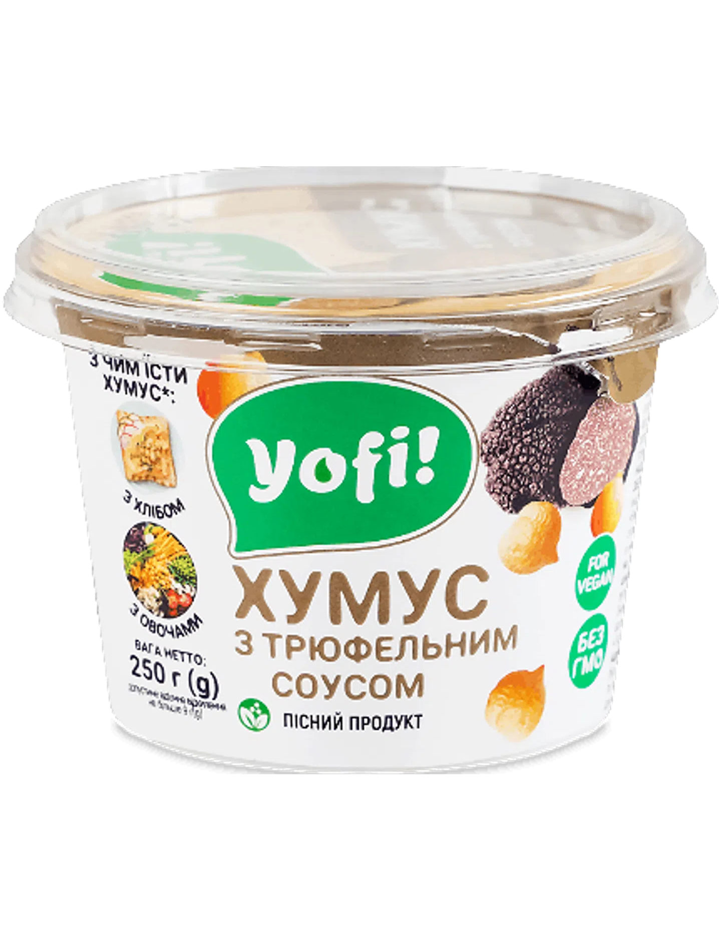 Склад: боби нуту варені 66%, олія соняшникова рафінована, насіння кунжуту, вода питна, соус з чорним трюфелем 3,5% (гриби печериці, олія соняшникова рафінована, олія оливкова екстра вірджин, чорні оливки, сіль кухонна, чорні трюфелі 1,1%, літній трюфель 1%, чорний трюфель 0,1%, ароматизатор), сіль кухонна, консерванти: сорбат калію, бензоат натрію, регулятор кислотності лимонна кислота, стабілізатор камедь гуарова, прянощі сушені мелені: часник, паприка, перець гострий.