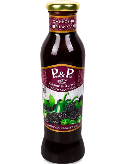 Ягідний солодко-гострий соус Ожиновий з перцем халапеньйо від Peri Peri насичений яскравим ягідним смаком соковитих ягід ожини та доповнений гострим перцем халапеньйо.