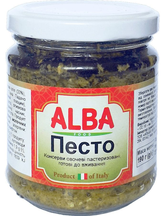 Склад: базилік (50%), соняшникова олія (33%), кеш'ю, волоські горіхи, сир Грана Падано (молоко, сіль, сичуг, яєчний лізоцим), картопляний крохмаль, сіль, цукор, оливкова олія першого холодного віджиму, часник, регулятор кислотності: молочна кислота. Продукт може містити сліди селери, люпину, молочних продуктів та горіхів.