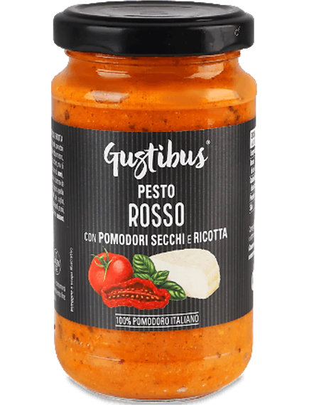 Gustibus Соус Песто Россо з в'яленими томатами та сиром рікотта — це смачний, зручний і ароматний соус, який ідеально підходить для різноманітних страв, додаючи їм італійського смаку з кремовою текстурою.