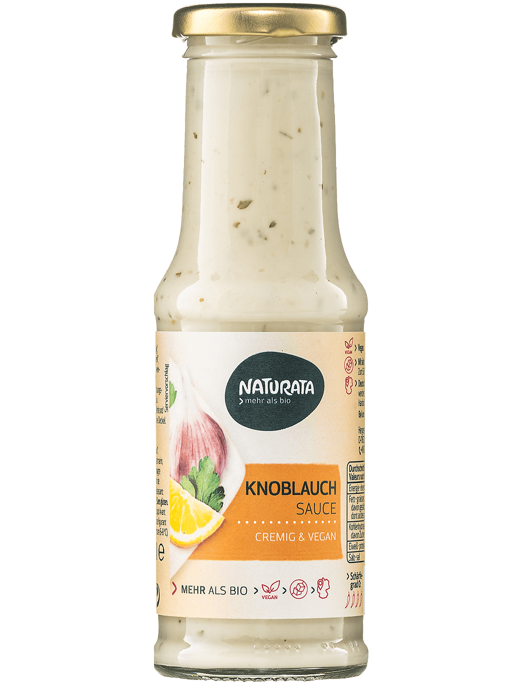 Вершково-часниковий соус справжнє враження від смаку завдяки інтенсивному часниковому аромату. Особливість в тому, що він веганський. Соус делікатно завершується нотками лимона та трав, таких як орегано та петрушка. З нульовим рівнем нагрівання чотирьох перців чилі він дуже м’який. Він ідеально поєднується з печеною картоплею та овочами, а також зі стейками, копченим тофу та іншими вегетаріанськими та веганськими альтернативами. Часниковий соус також дуже підходить як доповнення до салатних заправок або соус до сирих овочів. Підсолоджується виключно сиропом агави. Як загусник ми використовуємо гуарову камедь.