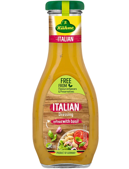 Салатний соус Італійський Kuhne Salatfix виготовлений за традиційним тосканським рецептом із додаванням високоякісної олії та приправлений спеціями й ароматними травами — орегано, чебрецем, базиліком, з легким ароматом часнику.