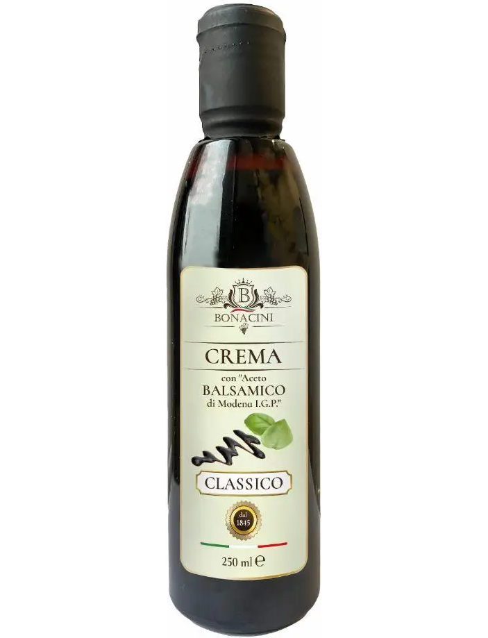 Склад: концентроване виноградне сусло, глюкозно-фруктозний сироп, бальзамічний оцет з Модени 20% (винний оцет, онцентроване виноградне сусло, барвник: карамель Е150D, антиоксидант: сульфіти), винний оцет, модифікований крохмаль, барвник Е150D. Містить сульфіти.