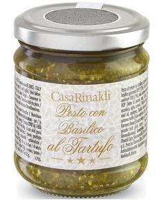 Склад: оливкова олія першого віджиму Extra Virgin, свіжі листя базиліку, трюфель, кедрові горіхи, горіхи кеш'ю, волоські горіхи, сіль морська, часник, сир Пекоріно Романо.