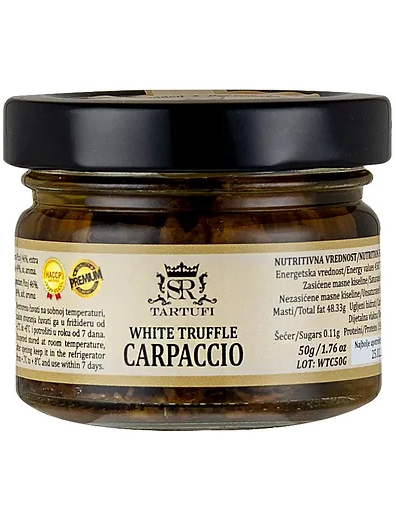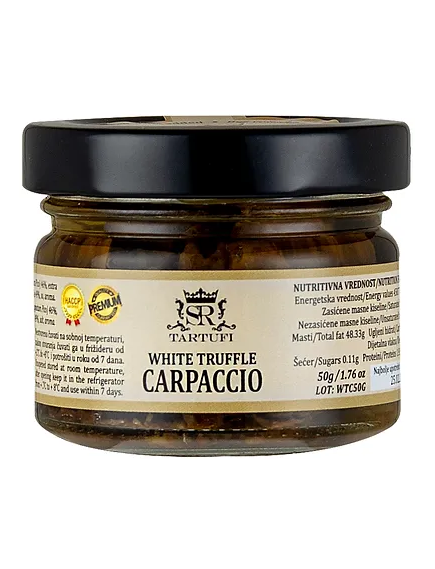 Склад: білий трюфель 46%, оливкова олія холодного віджиму та рослинна олія 49%, сіль, ароматизатор.