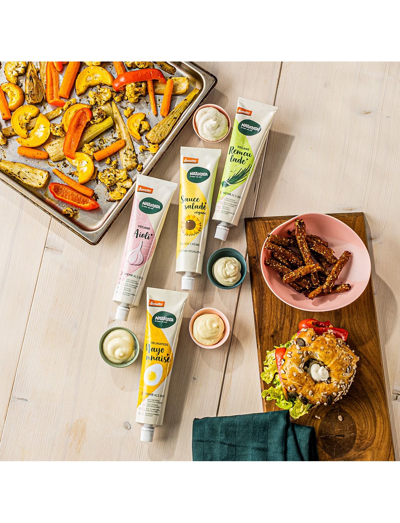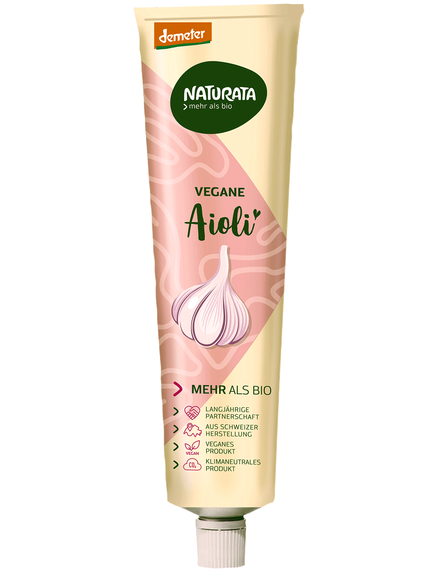 Для веганського айолі Naturata використовує лише високоякісну соняшникову олію Demeter, яку м’яко пресують (холодного віджиму) без зовнішнього нагрівання. Перед переробкою на айолі соняшникова олія дезодорується парою. Це покращує термін зберігання нашого айолі, а його ніжний смак не маскується ароматом олії. Для веганського айолі соняшникову олію змішують з іншими інгредієнтами та ретельно гомогенізують. Соняшниковий протеїн служить емульгатором, щоб жирні і водянисті інгредієнти (олія або оцет і вода) краще змішувалися в емульсію. Цей крок вимагає досвіду і чуйності.