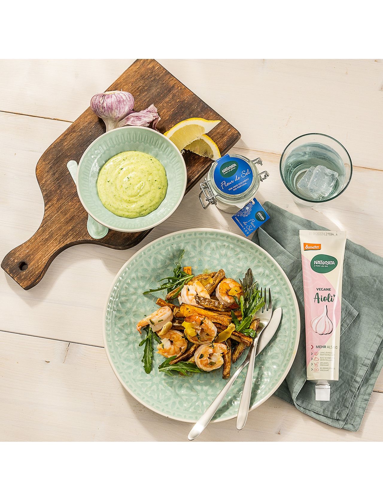 Веганський айолі Naturata не містить яєць. Замість нього в якості емульгатора виступає білок соняшнику. Він також містить менше олії, а тому містить менше жиру та калорій, ніж майонез Naturata. Камедь плодів рожкового дерева і гуарова камедь забезпечують правильну консистенцію крему.