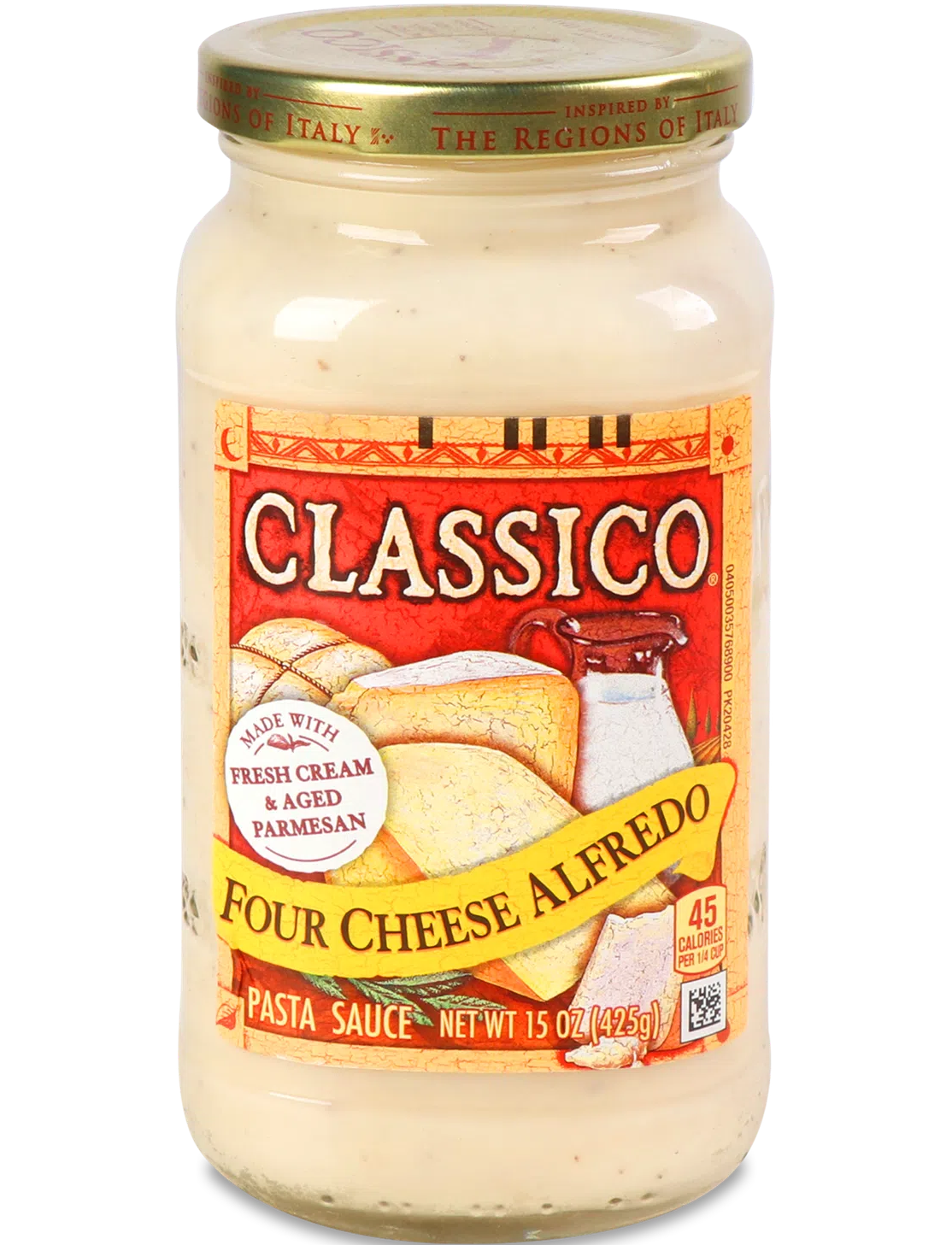 Надайте справжнього італійського смаку улюбленим рецептам вашої родини за допомогою соусу для макаронів Альфредо з чотирма сирами Classico. Наш готовий до вживання соус простий у приготуванні та має насичений ароматний смак. Наш соус поєднує свіжі вершки з рікотою, пармезаном, романо та сиром азіаго. Просто проваріть і подавайте наш вершково-сирний соус до улюблених макаронних виробів для смачної страви. Використовуйте наш безглютеновий білий соус до свого курячого альфредо, пасти з креветками або фетучіні альфредо. Обов’язково охолоджуйте нашу банку з соусом на 15 унцій після відкриття. У Classico є смак для кожного у вашій родині, від соусу для пасти Альфредо з чотирма сирами до гострого соусу для пасти з помідорами та базиліком.