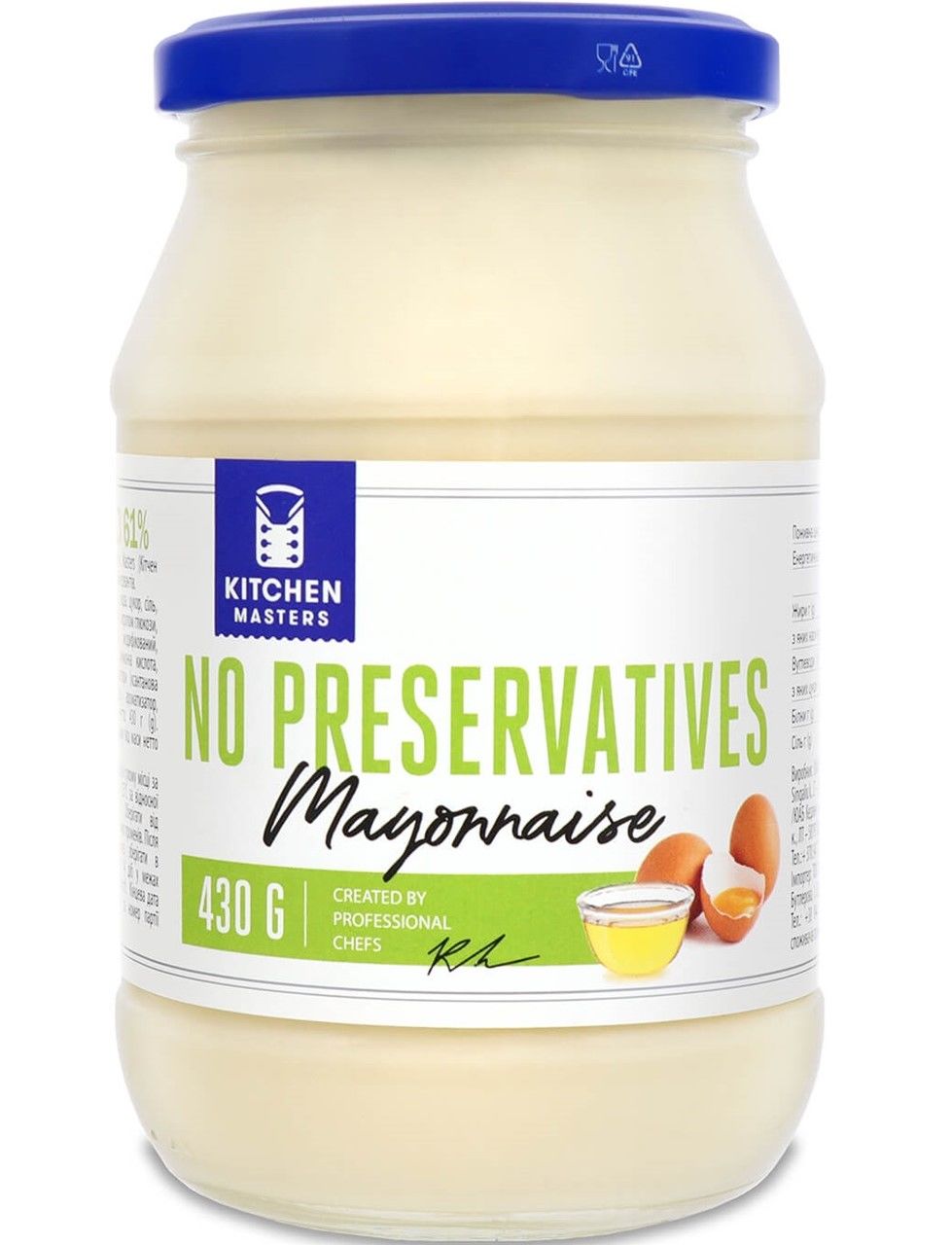 Склад: рапсова олія (73%), вода, спиртовий оцет, рідкий яєчний жовток (3%), гірчиця (вода, гірчичне насіння, спиртовий оцет, сіль, приправи), сіль, ароматизатори, загусники (E412, E415), барвник E160a, антиоксидант E38.