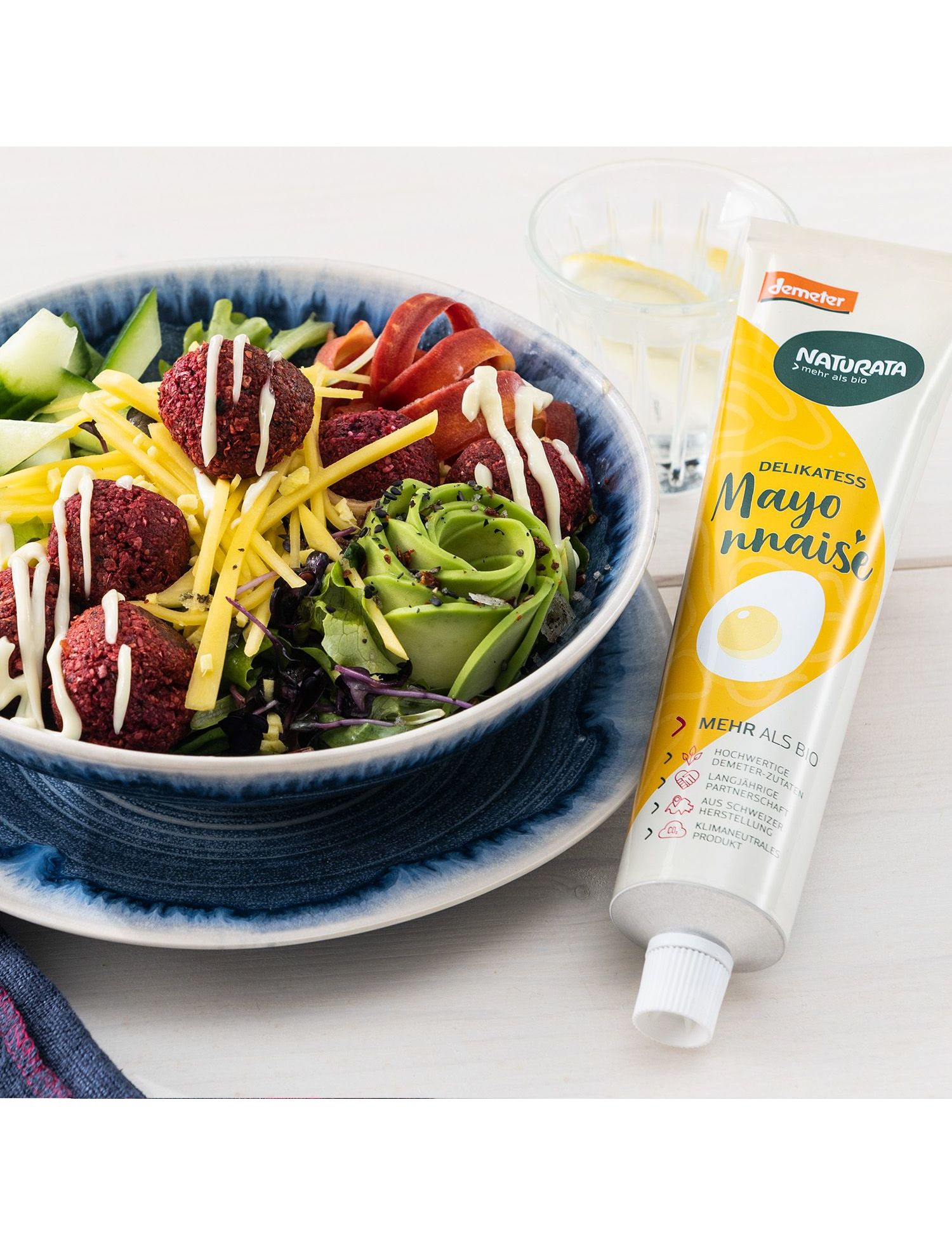Для всіх майонезів Naturata використовує лише високоякісну соняшникову олію Demeter, яка піддається м’якому (холодному) віджиму без зовнішнього нагрівання. Перед переробкою на майонез соняшникова олія дезодорується парою. Це покращує термін зберігання нашого майонезу, а його ніжний смак не маскується ароматом олії. Для майонезу Натурата делікатес пастеризовані яйця Деметра змішують із соняшниковою олією та іншими інгредієнтами та ретельно гомогенізують. Цей крок вимагає досвіду і чуйності.