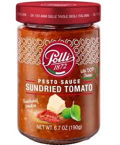 Polli PESTO ІЗ СУШЕНИМИ ПОМІДОРАМИ ТА СИРОМ народився з багаторічної традиції досвіду та пристрасті до італійської кухні. Смачні в’ялені помідори в поєднанні зі свіжим італійським базиліком і СИРАМИ ДОП для червоного песто, яке можна поцілунувати!
