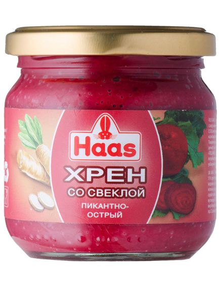 Хрін із червоним буряком Haas має яскравий смак завдяки великій кількості буряка. Класичний смак сподобається шанувальникам традиційної української кухні. Підходить для свіжих овочевих салатів, приготування соусів і супів, а також чудово доповнить страви з м'яса та риби. Хрін із буряком зробить багатшим смак щоденних і святкових страв.