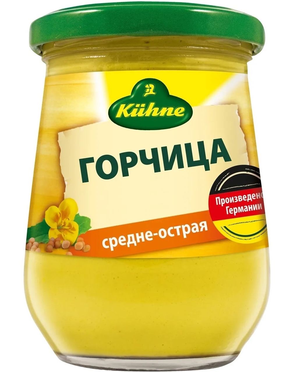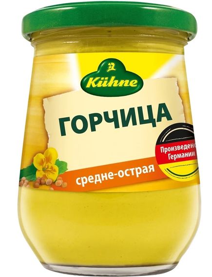 Класична середньогостра гірчиця Kuhne — ароматна, пряна, середньої гостроти, приготовлена за старовинними домашніми рецептами зі свіжомелених зерен гірчиці, запашної зелені та спецій.