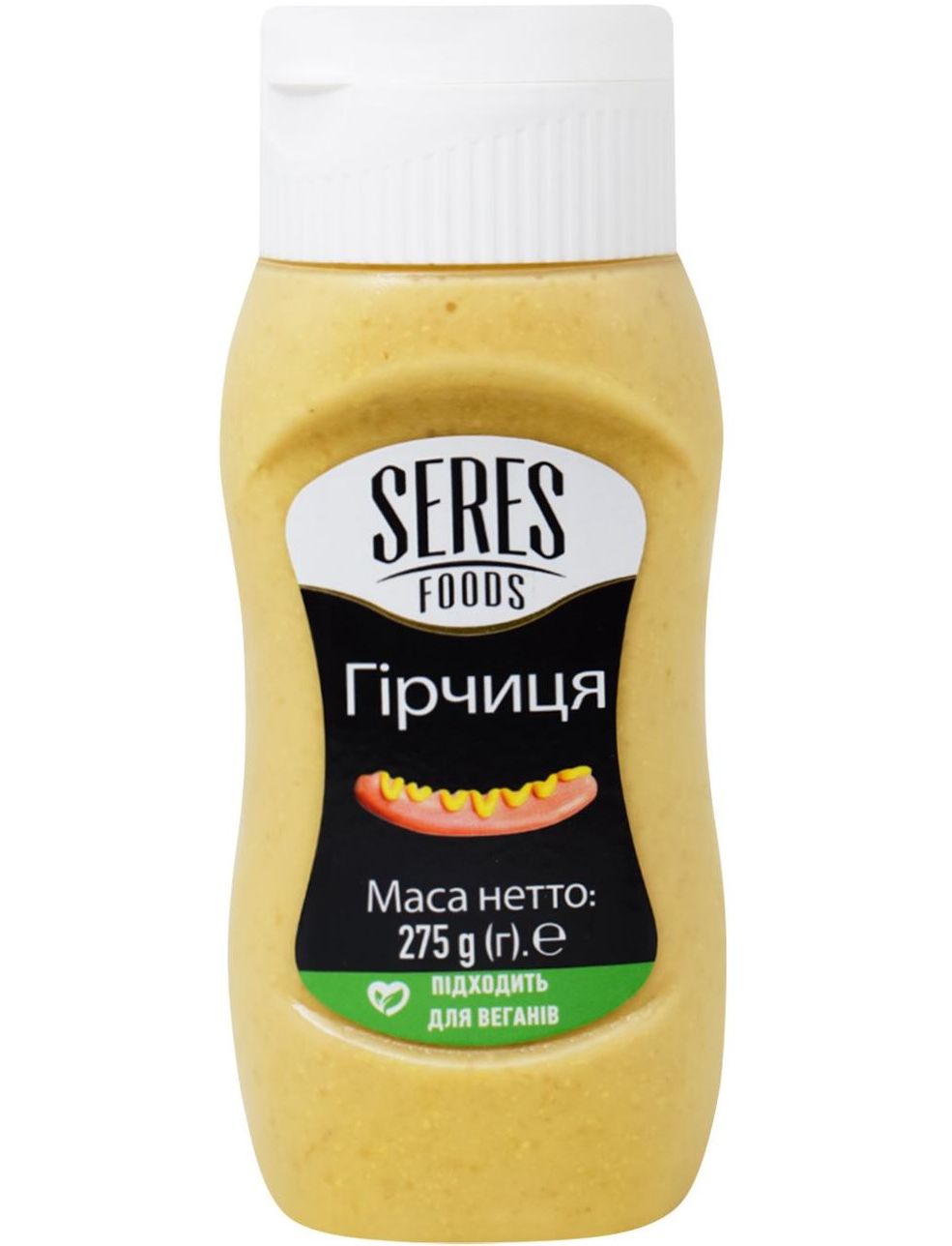 Склад: вода (54%), гірчиця (17%), оцет (17%), цукор (4%), крохмаль (2%), сіль кухонна (2%), ароматизатор спецій (2%), спецій (1,4%), регулятор кислотності – лимонна кислота (0,5%), консервант – сорбат калію (0,05%) і бензоат натрію (0,05%), гірчиця Conains.