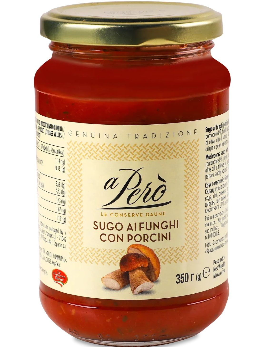Склад: томатна м'якоть 78%, томатна паста 8%, білі гриби (Boletus Edulis) 4%, вода, сіль, оливкова олія першого віджиму, олія соняшникова, цукор, цибуля, білий винний оцет, часник, орегано, перець, петрушка, регулятор кислотності : E270, антиоксидант: E300.