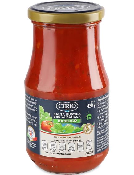 Склад: помідори 82% (помідори нарізані, томатне пюре), цибуля, морква, цукор, соняшникова олія, оливкова олія першого віджиму, сіль, модифікований крохмаль, базилік 0,6%, біле вино, часник, натуральний ароматизатор базилік, регулятор кислотності: лимонна кислота.