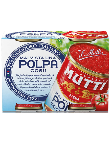 М’якоть томатів Mutti у дуже дрібних шматочках зберігає всю свіжість свіжозібраних помідорів. Це унікальний продукт, оскільки його найбільш м’ясоподібна частина поєднується з томатним соком, нарізаним на дуже дрібні шматочки, що робить його стійким до тривалого приготування, навіть при високих температурах, наприклад, у духовці. Він ідеально підходить для домашньої піци, для приготування рецептів на основі м'яса, овочів або бобових, а також для приправ свіжої манної каші або яєчної пасти.