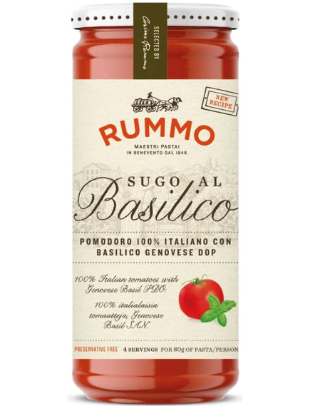 Склад: томатне пюре 83,1%, овочі в різних пропорціях (морква, цибуля, селера), олія соняшникова, базилік Genovese PDO 2%, цукор, концентрований лимонний сік, сіль.