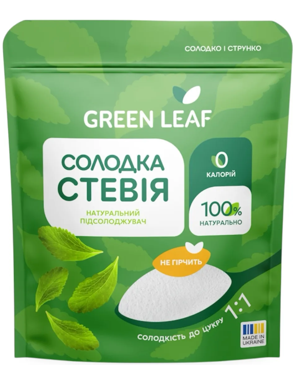 Натуральний підсолоджувач GREEN LEAF, що вже так полюбився споживачам. Він не містить калорій, тому не зашкодить вашій фігурі. Солодка Стевія для тих, хто піклується про своє здоров’я. Підходить для людей з діабетом, безпечна для дітей і вагітних.