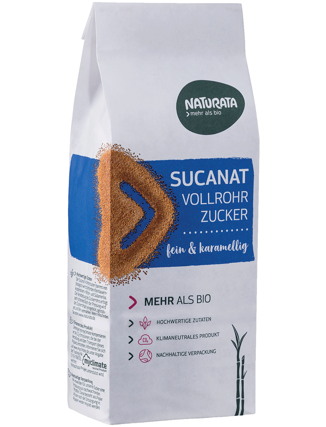 Цільний тростинний цукор Naturata Sucanat містить всю частину патоки цукрової тростини. Це надає йому землистого вигляду та інтенсивного карамельного солодового смаку. Це надає солодким стравам і випічці, а також гарячим напоям особливий аромат.