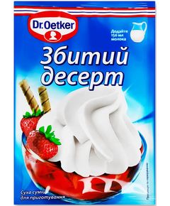 Збитий десерт з вершковим смаком Dr. Oetker додасть святковий вигляд будь-якому десерту. Він легко готуються, потрібно тільки збити суміш з молоком. З 1 пакетика сухої суміші виходить 1 л готових збитих вершків. Збиті вершки приготовані з суміші Dr. Oetker можна використовувати як окремо, так з фруктами і з кавою.