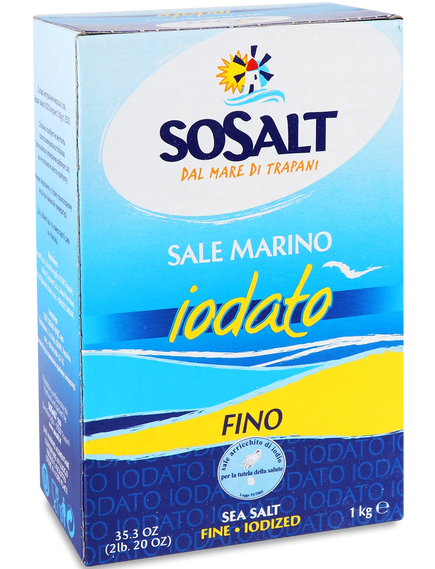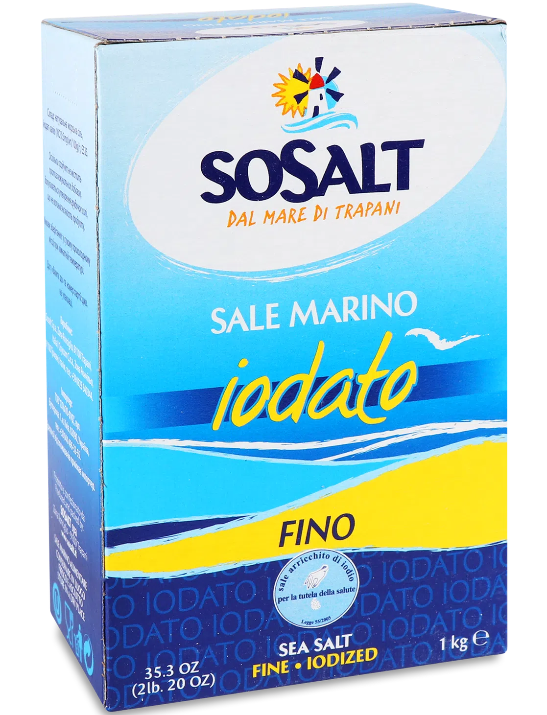 SoSalt Сіль морська дрібна йодована 1 кг – це натуральна морська сіль дрібного помелу, збагачена йодом. Вона виготовляється шляхом випаровування морської води з додаванням йодиду або йодату калію для профілактики йододефіциту. Виробник SoSalt – італійська компанія, що спеціалізується на виробництві якісної морської солі.