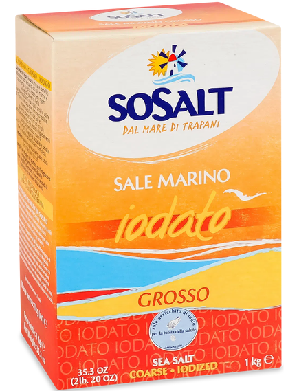 SoSalt Сіль морська крупна йодована 1 кг – це натуральна морська сіль великого помелу, збагачена йодом. Вона виготовляється шляхом випаровування морської води з додаванням йодиду або йодату калію для профілактики йододефіциту. Виробник SoSalt – італійська компанія, яка спеціалізується на виробництві якісної харчової солі.
