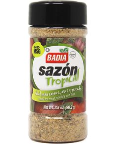 Склад: сіль, зневоднений часник і цибуля, спеції, динатрієвий гуанілат та інозинат, перець і трикальційфосфат (агент проти злежування). Додайте інший ритм своїй кулінарії з Badia Sazón Tropical®. Побризкайте цією пікантною сумішшю яловичину, птицю або рибу для тропічного відтінку, який...