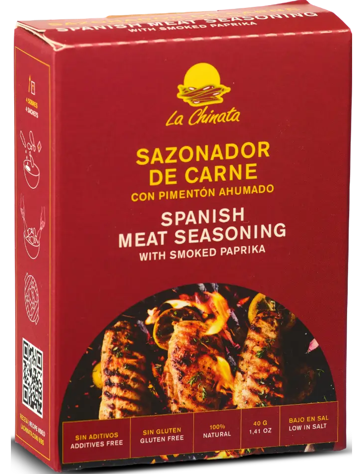 Іспанська приправа для м’яса в основному розроблена з нашого копченого порошку паприки «Finca la Barca» та наших копчених пластівців паприки. Це 100% натуральний продукт без будь-яких барвників та консервантів. Не містить глютену.