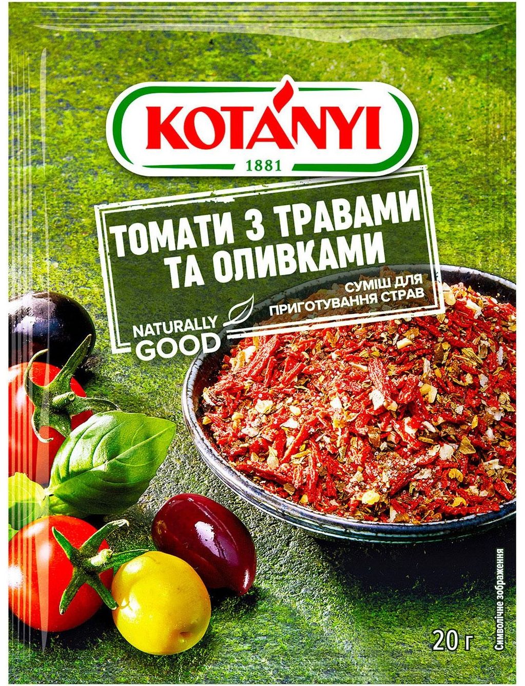 Склад: томатні пластівці (томатна паста, кукурудзяний крохмал) (56,5%), сіль йодована (сіль харчова, йодид калію), оливки гранульовані (7,5%), базилік, цибуля, орегано, часник, цукор, шавлія.