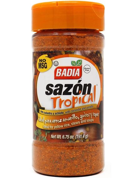 Badia Sazón Tropical® з коріандром і анато поєднує свіжий анато і коріандр з іншими острівними спеціями для чудового смаку. Приправте улюблений суп, рис або рагу для насиченого смаку тропіків.
