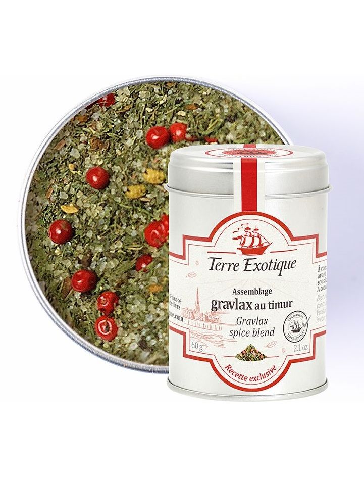 Збірка gravlax була розроблена нашими командами, щоб спростити приготування маринадів gravlax. Ягода Тімур, додана до цієї суміші, є ноткою Terre Exotique, яка надає оригінальної сторони, сповненої бадьорості, вашій страві.