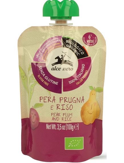Грушево-сливове пюре Alce Nero з рисовим борошном не містить глютену та виробляється без додавання інших цукрів, окрім тих, які природно присутні у фруктах. Він також ідеально підходить поза домом завдяки практичній упаковці, що стискається.