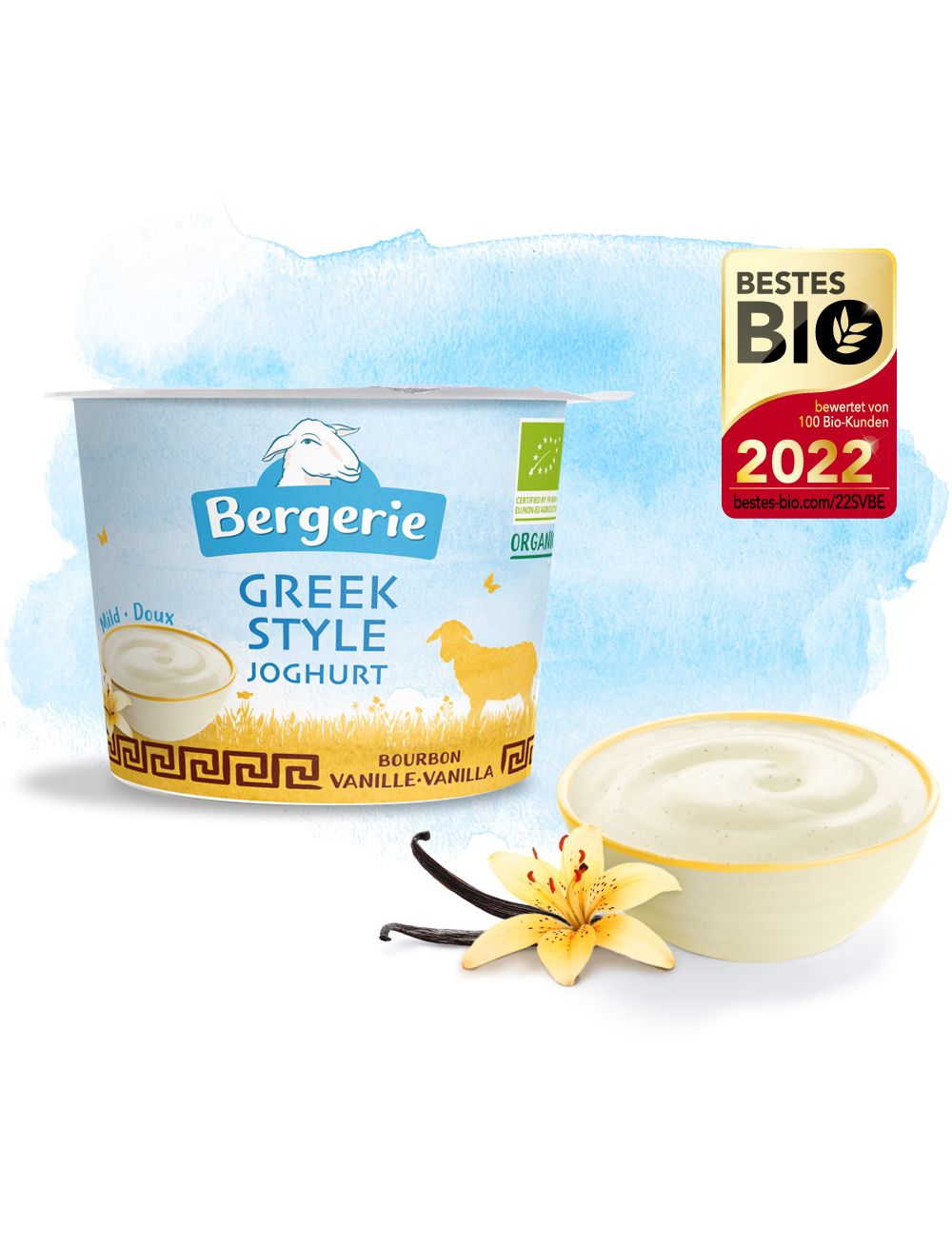 Органічний ванільний йогурт у грецькому стилі, виготовлений з овечого молока з високим вмістом жиру, дуже вершковий, з легким цукром, з бурбонською ваніллю. Насолоджуватися охолодженим!