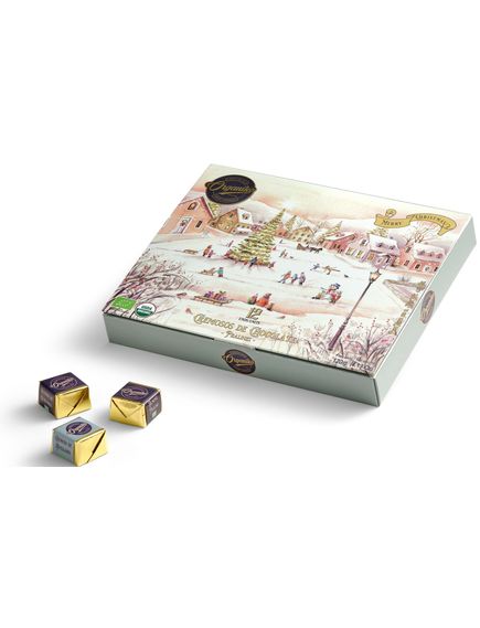 12 різдвяних кремів, виготовлених з 36% какао молочного шоколаду та лісових горіхів або мигдалю.