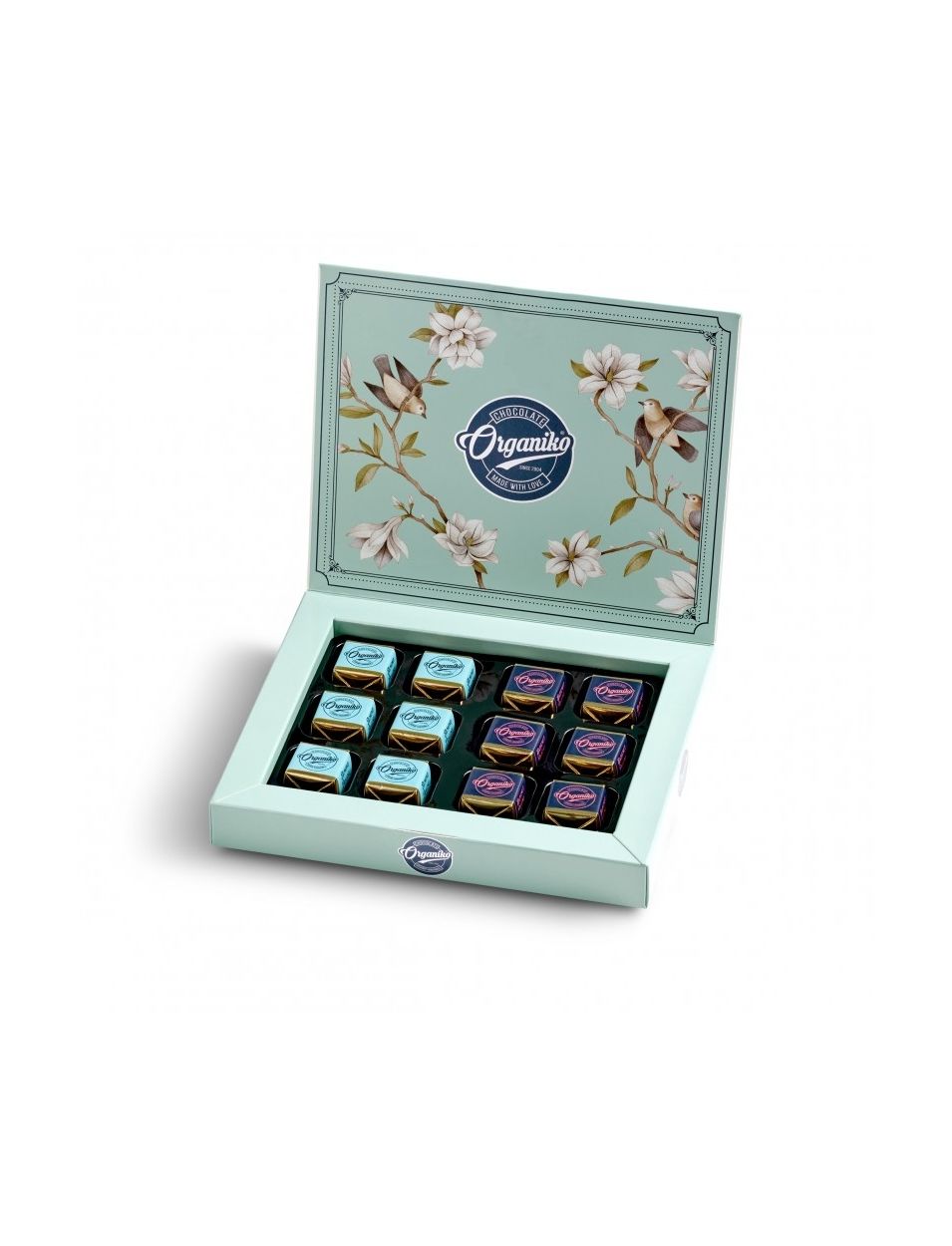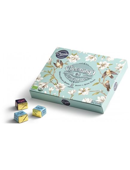 12 цукерок виготовлених з 36% какао молочного шоколаду та лісових горіхів або мигдалю.
