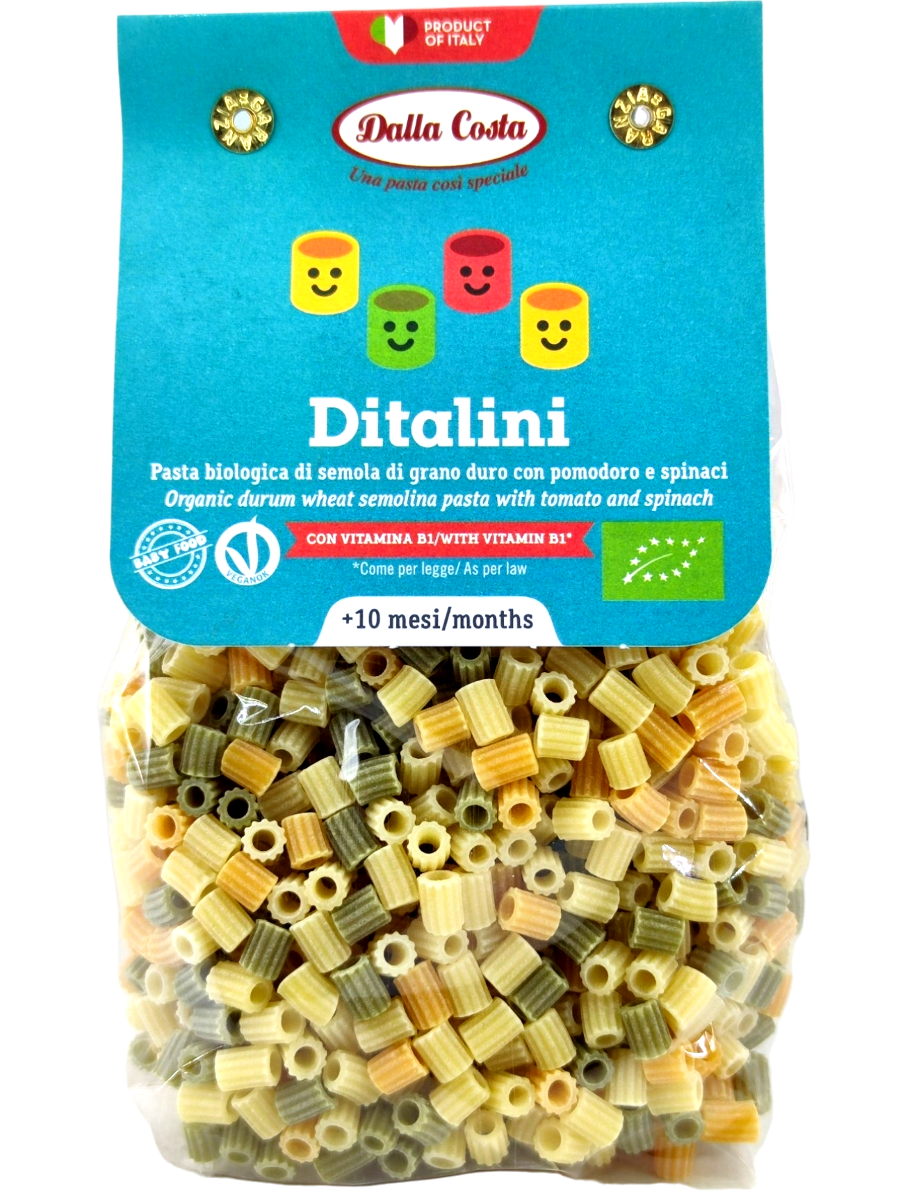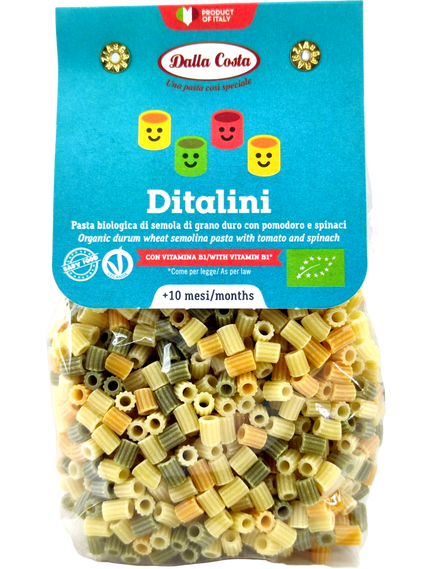 Склад: органічне борошно з твердих сортів пшениці Семола, зневоднені органічні помідори 0,8%, зневоднений органічний шпинат 0,4%, тіамін (Вітамін B1).