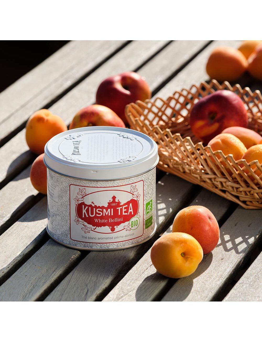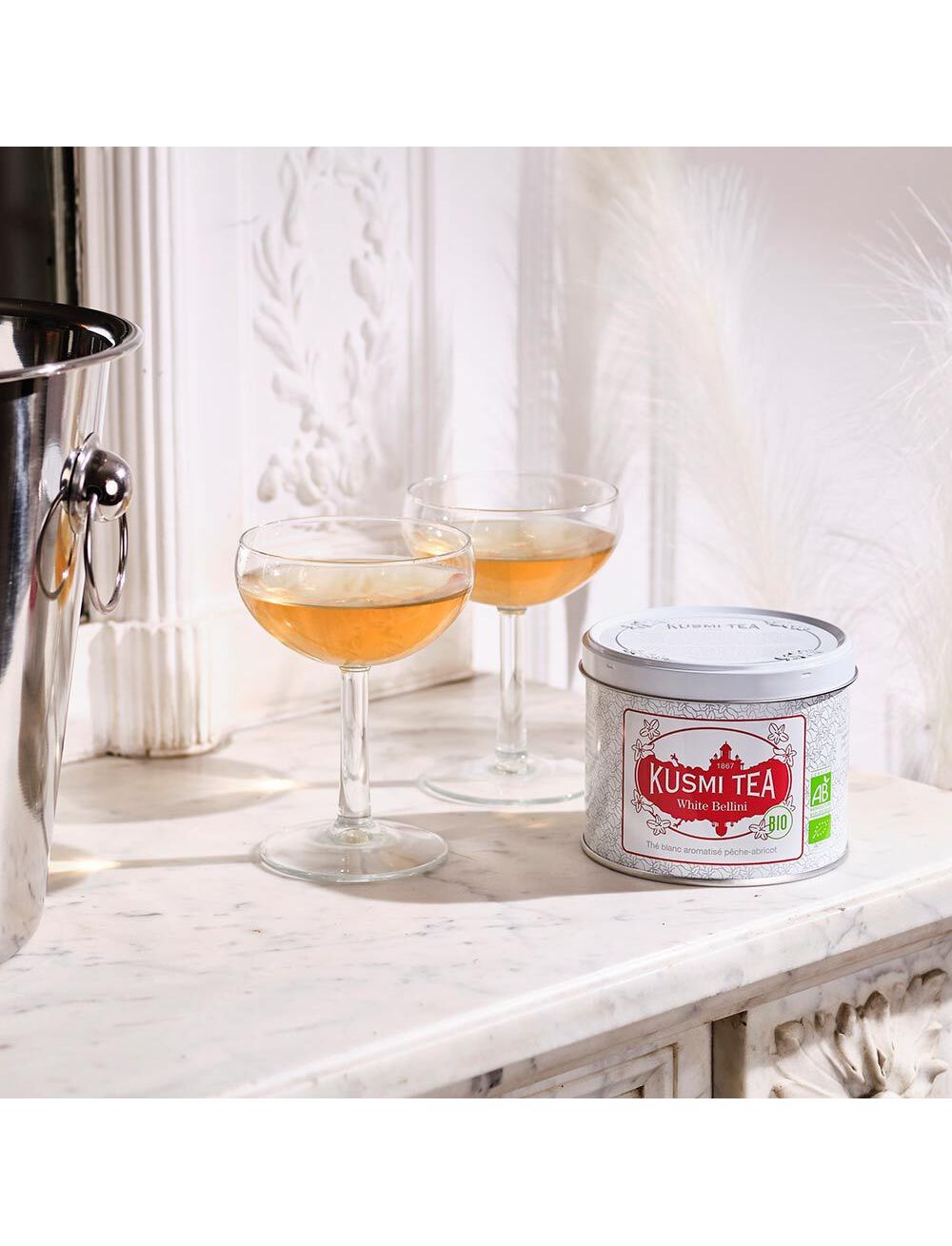 На вашому столі піраміда з келихів для шампанського готується зустріти зірку коктейлів: Білого Белліні. Вишуканий, він містить фруктовий крем: соковитий персик і оксамитовий абрикос, звісно, на основі білого чаю. Найніжніший з усіх, з якого ми збираємо лише молоді пагони. Його вам подають каскадом, і ви споживаєте його без міри. Ви праві, це так добре!