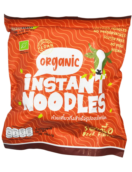Склад. Органічна локшина з коричневого рису: коричневий рис, вода, смак органічної яловичини: органічний часник, органічна кінза, органічний соєвий соус, органічний перець, органічна сушена цибуля, органічний порошок чилі, органічний галангал, органічна кориця, органічний аніс, органічний тростинний цукор, органічна кокосова олія, сіль, вода, лимонна кислота.