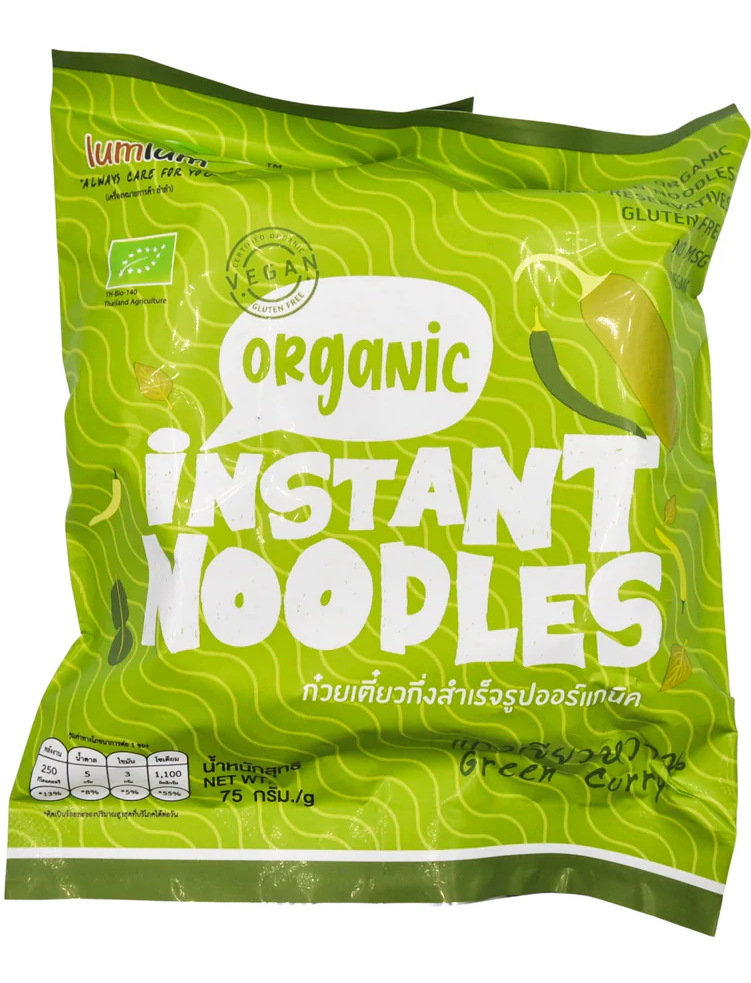 Склад. Органічна локшина з коричневого рису: коричневий рис, вода. Органічна зелена паста каррі: органічний лемонграсс, органічний перець чилі, органічний галангал, органічні ферментовані соєві боби, органічна цибуля-шалот, органічний часник, органічна куркума, органічне сушене насіння коріандру, органічний кафрський лайм, органічний сушений кмин, сіль, вода, органічний тростинний цукор, органічне кокосове молоко, лимонна кислота.