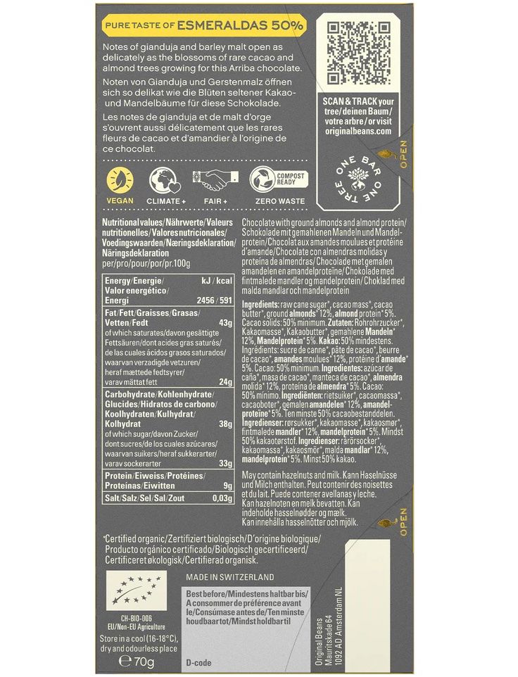 Ноти джандуї та ячмінного солоду відкриваються так само делікатно, як цвіт рідкісних какао та мигдальних дерев, що ростуть для цього шоколаду Arriba.