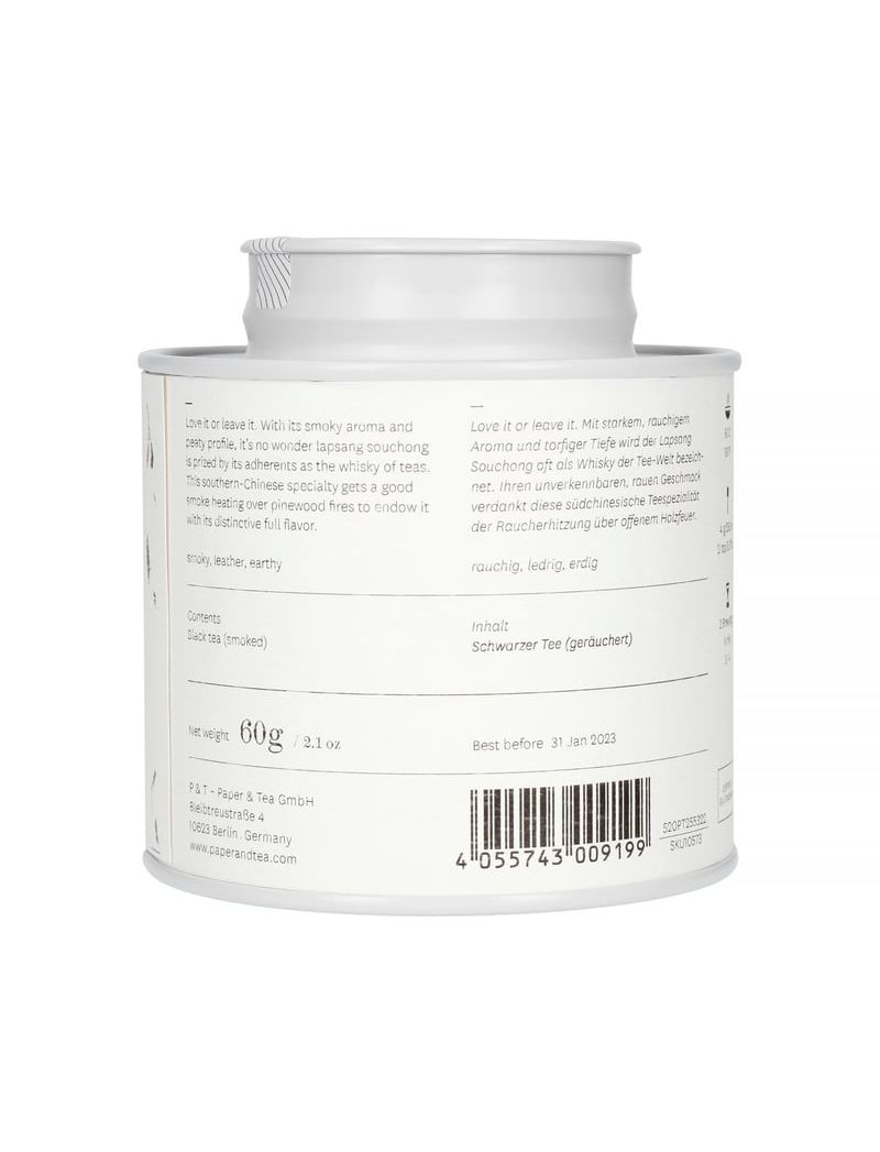 Маючи сильний димний аромат і торф’яну глибину, Lapsang Souchong часто називають віскі в чайному світі. Своїм безпомилковим сирим смаком цей південнокитайський фірмовий чай завдячує копченню на відкритому вогні.