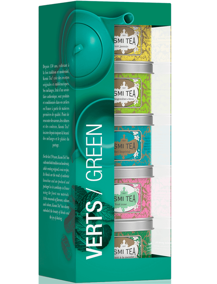 Увага любителям ароматизованих зелених чаїв: ви знайдете те, що шукаєте, у коробці органічних зелених чаїв Kusmi, ідеально підходить для відкриття або демонстрації домашніх сумішей.