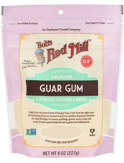 Гуарова камедь - це борошноподібна речовина, виготовлена з насіння рослини, яка походить із Південно-Східної Азії. Використовуйте невеликі кількості як загусник і емульгатор для соусів і заправок, або як сполучну речовину і підсилювач об’єму для випічки. Це популярний інгредієнт для безглютенової випічки.